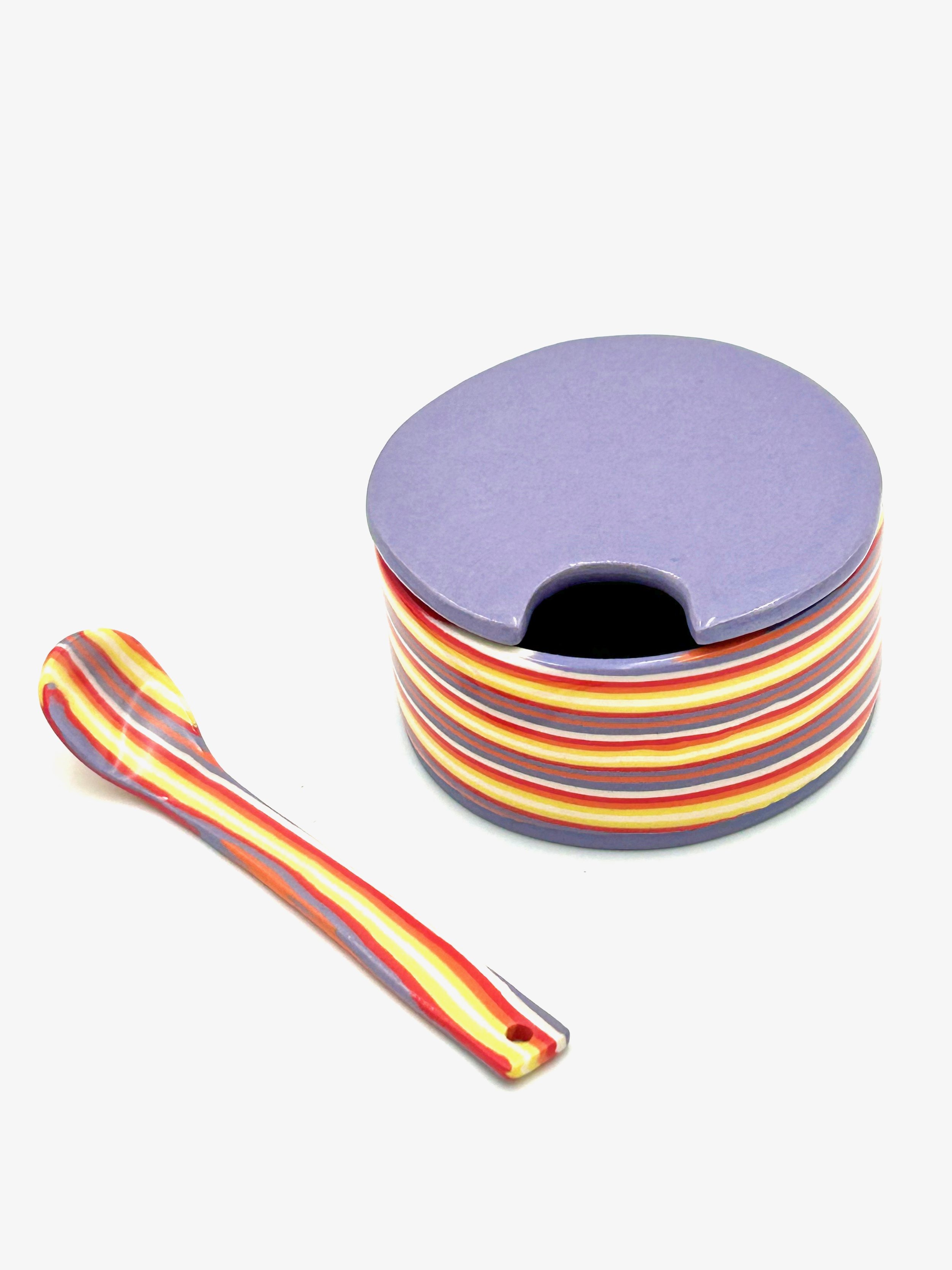 Image 1 of 1 10 Layer Cake Jam Bowl with Spoon and Lid $85.00 Jam bowl (3” diameter x 1 1/2” tall) and spoon in 10 Layer Cake pattern with purple lid. Porcelain. Add To Cart Added! Jam bowl (3” diameter x 1 1/2” tall) and spoon in 10 Layer Cake pattern with purple lid. Porcelain.